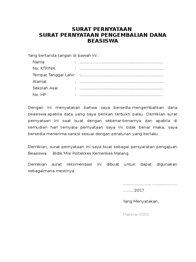 Nah, jika sobat ingin membuat sebuah perjanjian dengan seseorang atau perusahaan ataupun dengan lembaga tertentu. Meskipun begitu surat resmi gak harus selamanya dibuat oleh keluarga, bisa jg disusun oleh individu. Contoh surat pernyataan pengembalian dana. Demikian, surat pernyataan ini saya buat sebagai persyaratan pengajuan beasiswa bidik misi poltekkes kemenkes malang. Surat pernyataan refund ignatius chandra wardana contoh surat pengembalian dana deposit 338630633 surat permohonan pengembalian kelebihan pembayaran kredit docx.